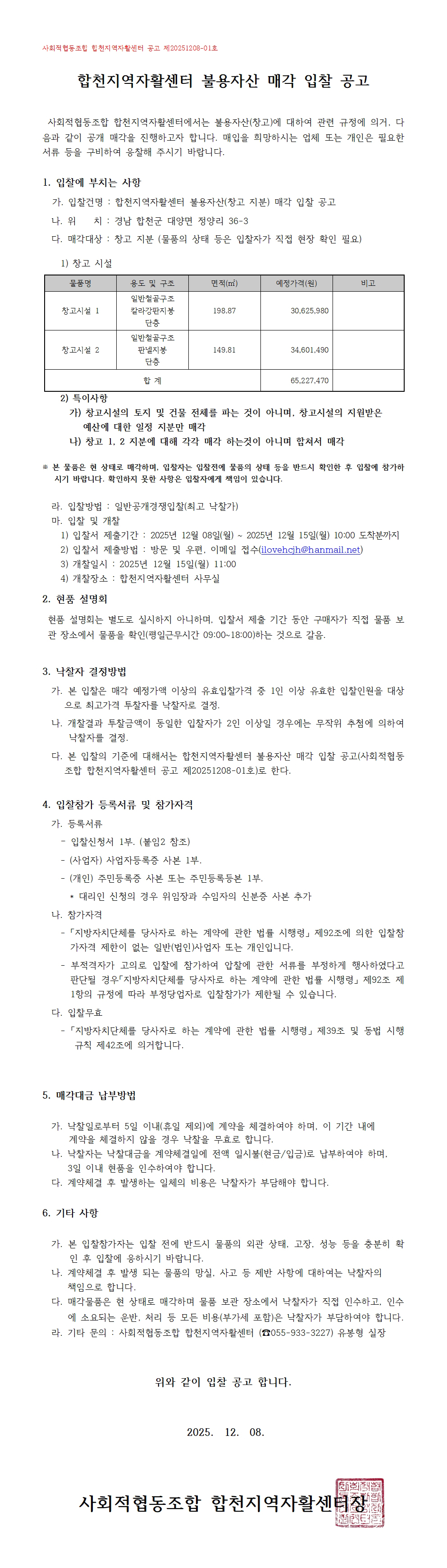 사회적협동조합 합천지역자활센터 불용자산 매각 입찰 공고